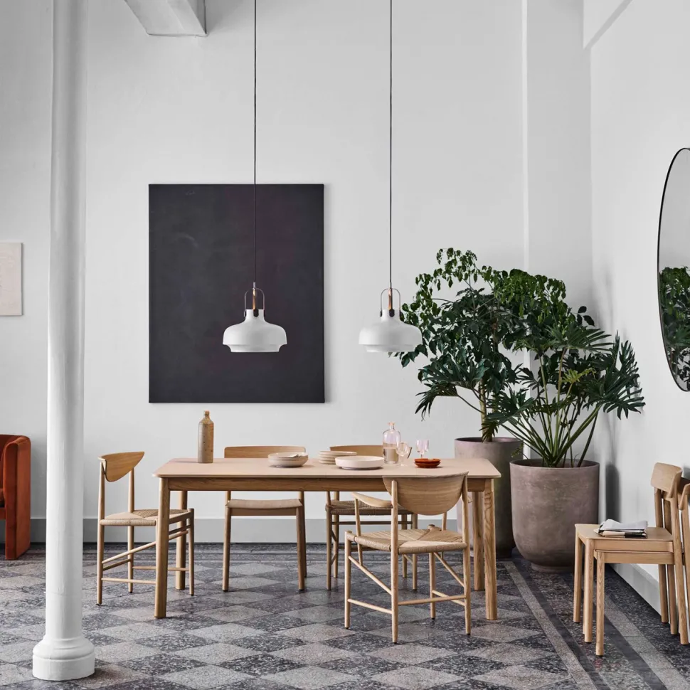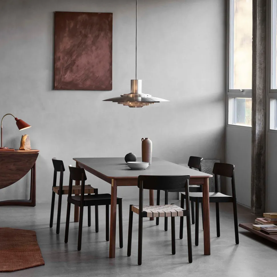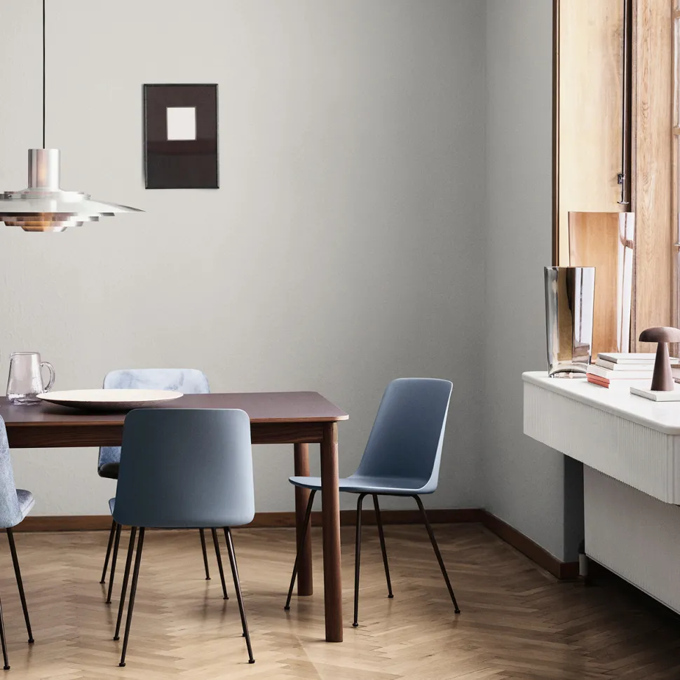Klassisk og elegant spisebord, som er designet af Hee Welling i 2020. Spisebordet er et udtræksbord, der er fremstillet med udgangspunkt i sommerfugleudvidelsesteknikken, hvis formål er at udvide bordet og herved skabe plads til flere mennesker. Bordets base er udført i træ, mens overfladen herpå er en glat laminatbordplade. Foruden dette er benene dråbeformede og hjørnerne er afrundede, hvilket tilføjer unikke designdetaljer. De bemærkelsesværdige detaljer understøttes tilmed af metalplasterne på hvert ben, der holder det sikkert sammen.