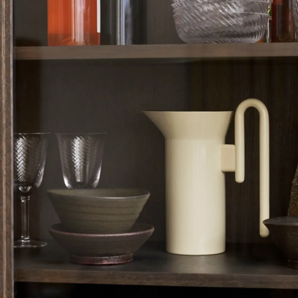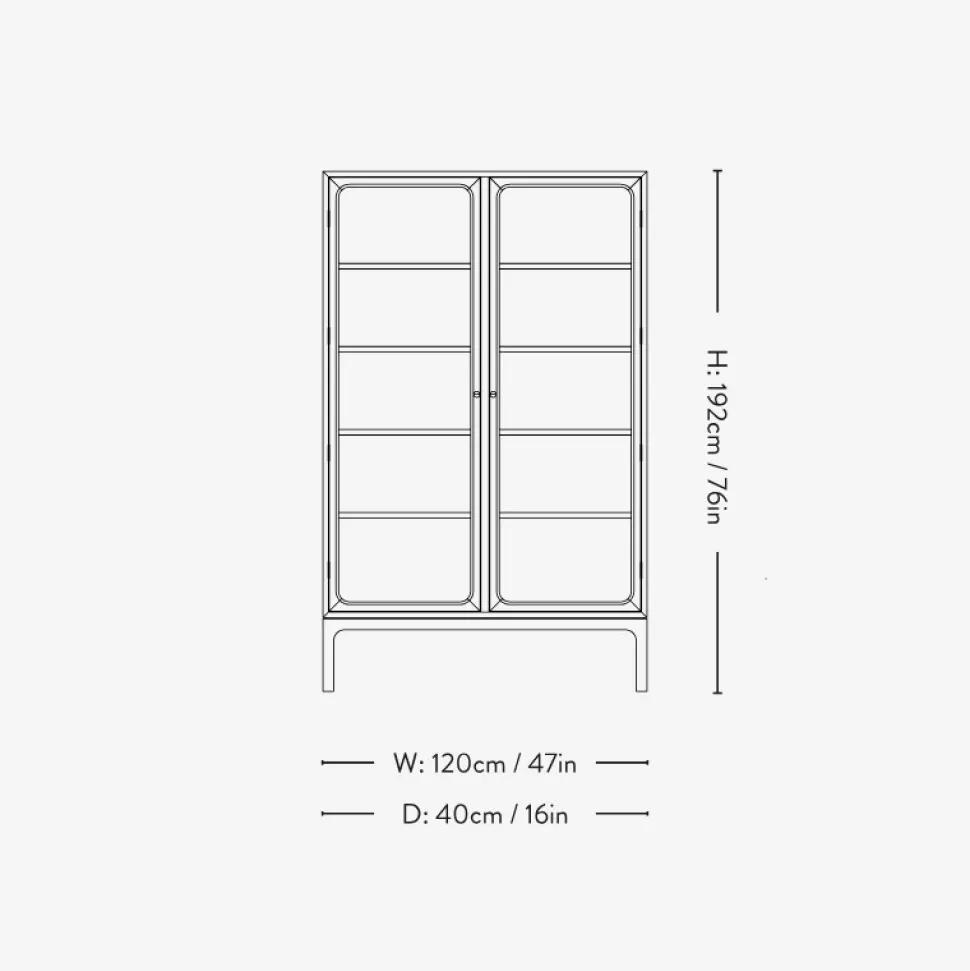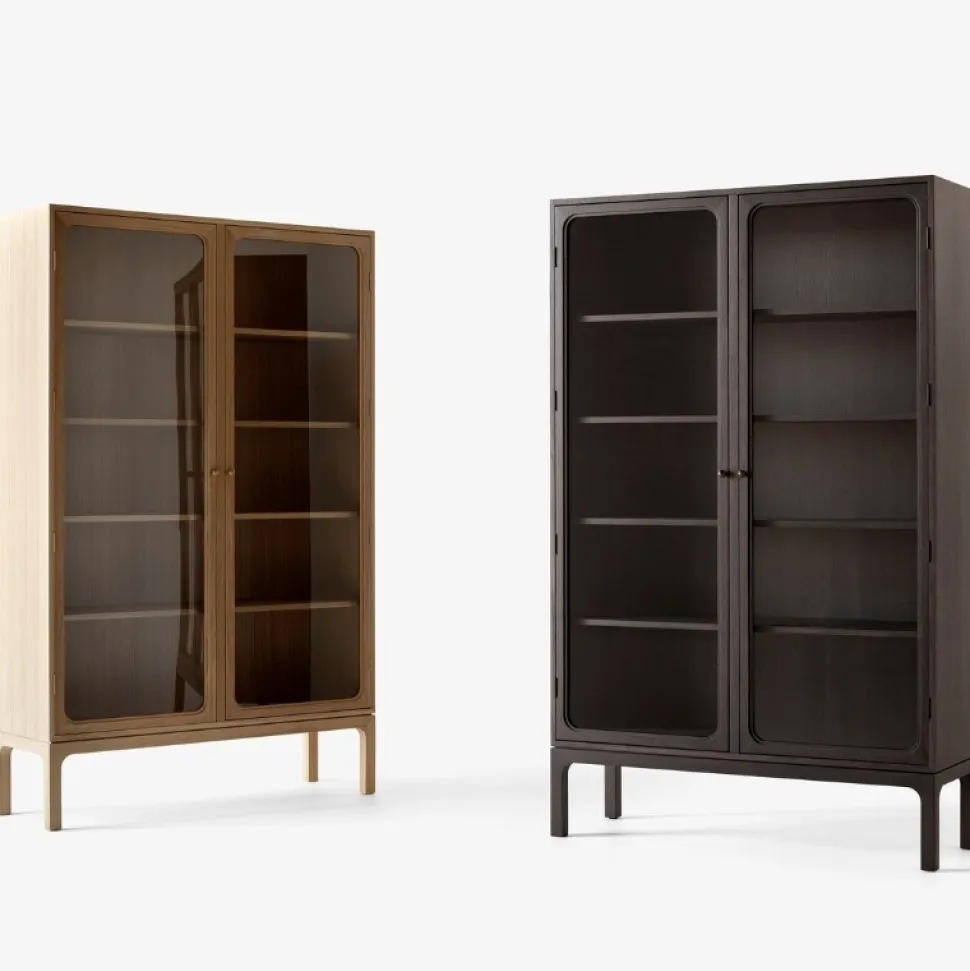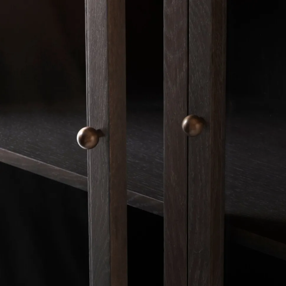 Trace er fremstillet med et solidt stel i massivt egetræ og egetræsfiner, og udstyret med glaslåger, der giver lethed og visuel transparens. Indvendigt byder skabet på rummelige hylder, ideelle til både dekorative objekter og praktisk opbevaring.
