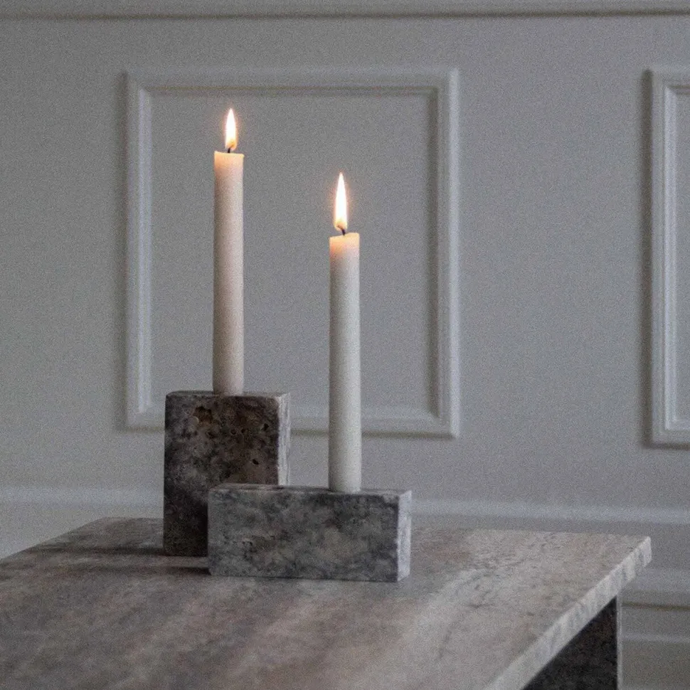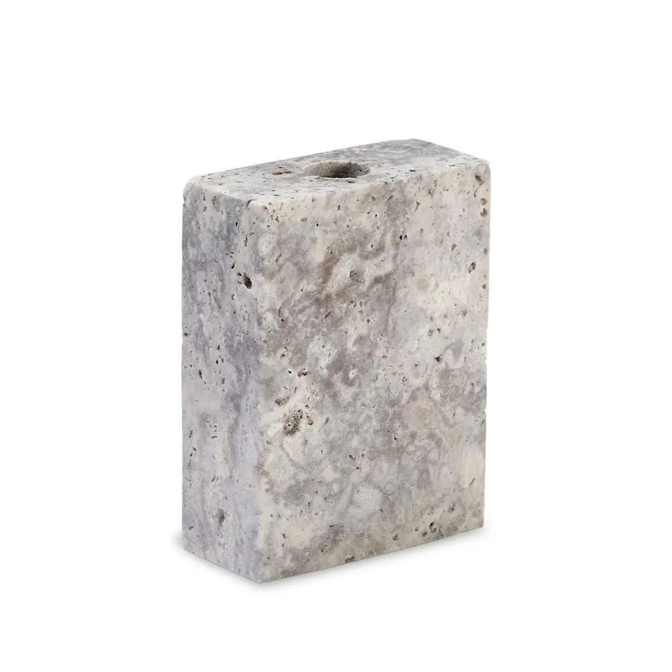 Enkel og æstetisk lysestage, der emmer af modernitetens minimalisme. Lysestagen er fremstillet af kalksten i den fineste farvenuance, der både rummer varme og kolde toner, hvorfor farvespillet smukt bevæger sig mellem de brune og grå nuancer. Qua det simple formsprog kommer stenen til sin ret, hvorfor stagen står smuk og sprudlende i al sin enkelthed.