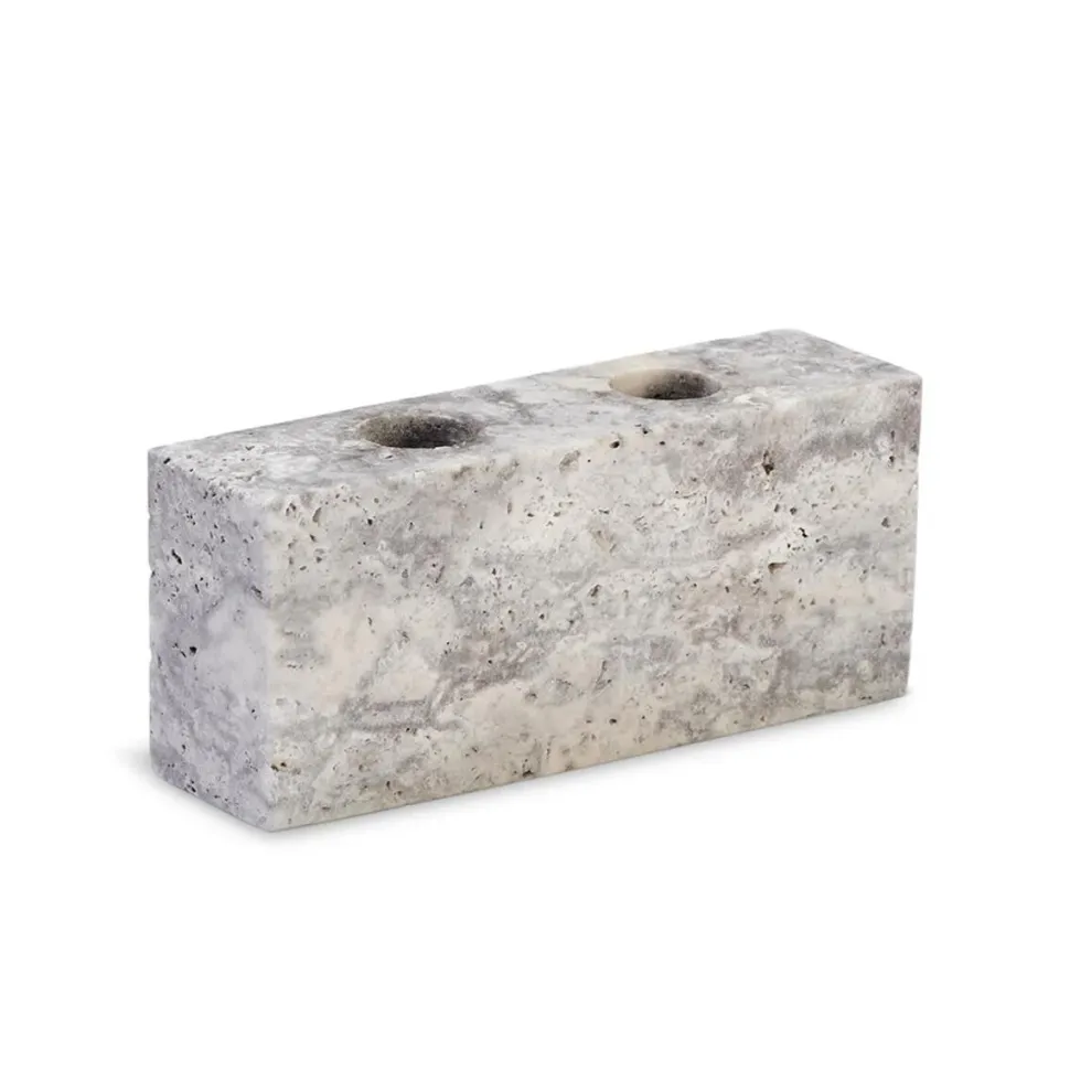 Smuk og æstetisk lysestage, der emmer af tidløs elegance. Lysestagen er fremstillet af kalksten i den fineste farvenuance, der både rummer varme og kolde toner, hvorfor farvespillet smukt bevæger sig mellem de brune og grå nuancer. Qua det simple formsprog kommer stenen til sin ret, hvorfor stagen står smuk og sprudlende i al sin enkelthed.