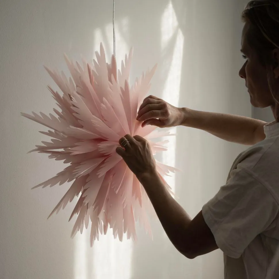Enkel og tidløs papirstjerne, der – uanset placering heraf – er en yndefuld indretningsdetalje. Stjernen er designet med iøjnefaldende spidser, hvilket er understøttende for det delikate og fjerlette udtryk. Papirstjernen er et sandt håndværk, foldet og limet i hånden. Lad stjernen lyse op i vinduet og skab en stemningsfuld atmosfære på de mørke vinteraftener.