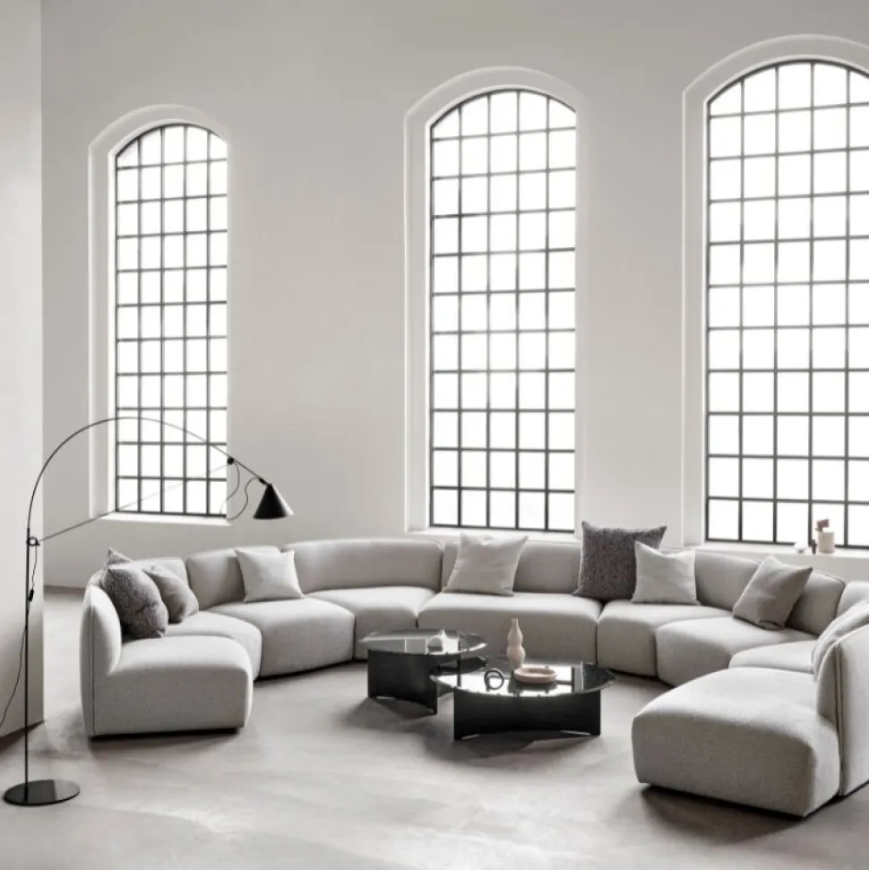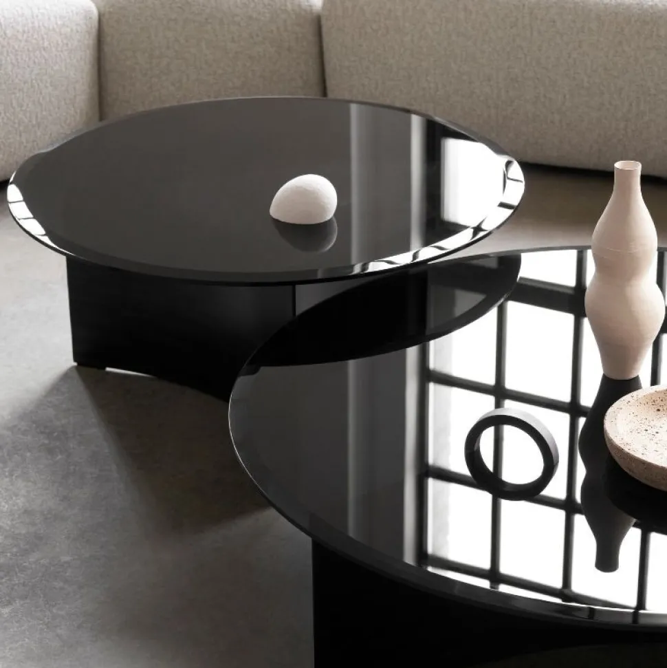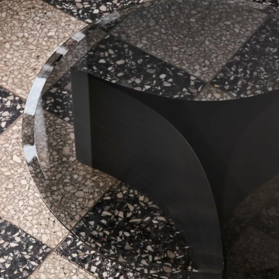 Arc er designet af Toan Nguyen og er sammensat af geometriske former, som danner et elegant og moderne sofabord. Kollektionen omfatter tre borde i forskellige højder og radier, fås i to farvekombinationer: Messingbelagt stålbund med hærdet røget glas bordplade eller sortpoleret stålbund med bordplade i sort hærdet glas.