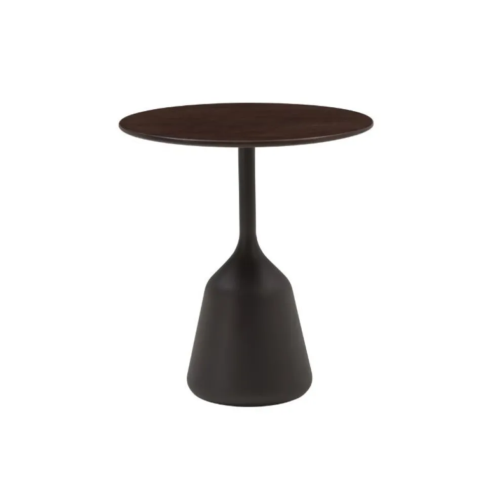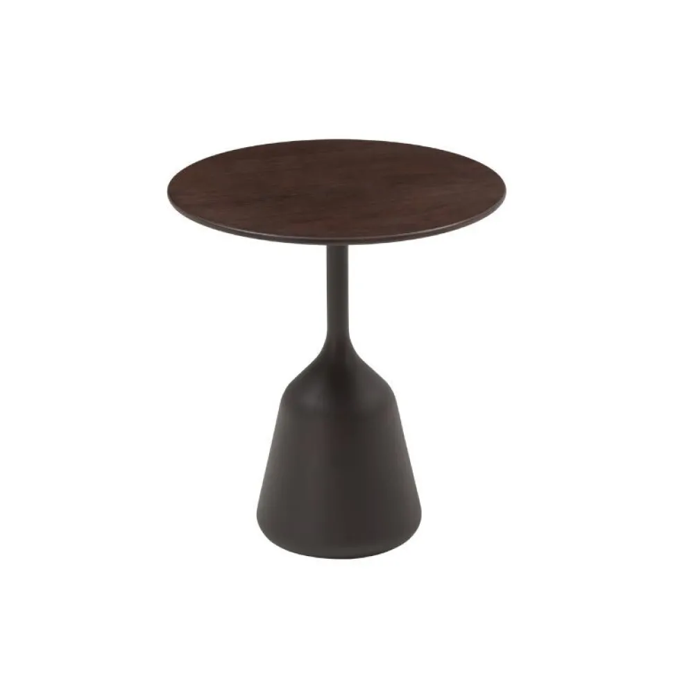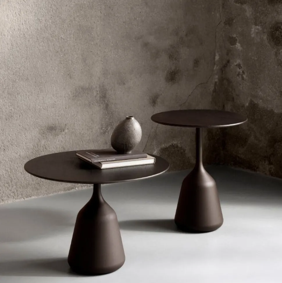 Elegant sidebord med rummelige former. Coin-serien fusionerer cirkulære og kegleformede komponenter. Coin er et geometrisk minimalistisk sidebord som smelter sammen, mens det skiller sig ud. Basen er støbt i brun pulverlakeret aluminium og pladen er af brunbejdset egefinér. Coin serien omhandler seks sideborde og seks spiseborde.