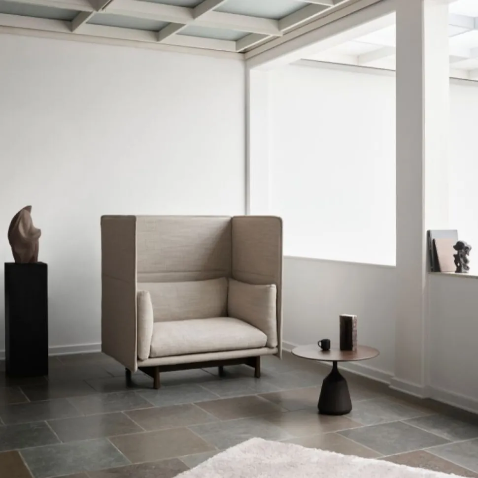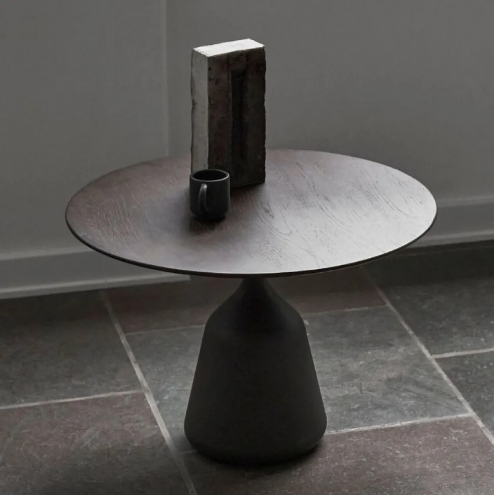 Elegant sidebord med rummelige former. Coin-serien fusionerer cirkulære og kegleformede komponenter. Coin er et geometrisk minimalistisk sidebord som smelter sammen, mens det skiller sig ud. Basen er støbt i brun pulverlakeret aluminium og pladen er af brunbejdset egefinér. Coin serien omhandler seks sideborde og seks spiseborde.