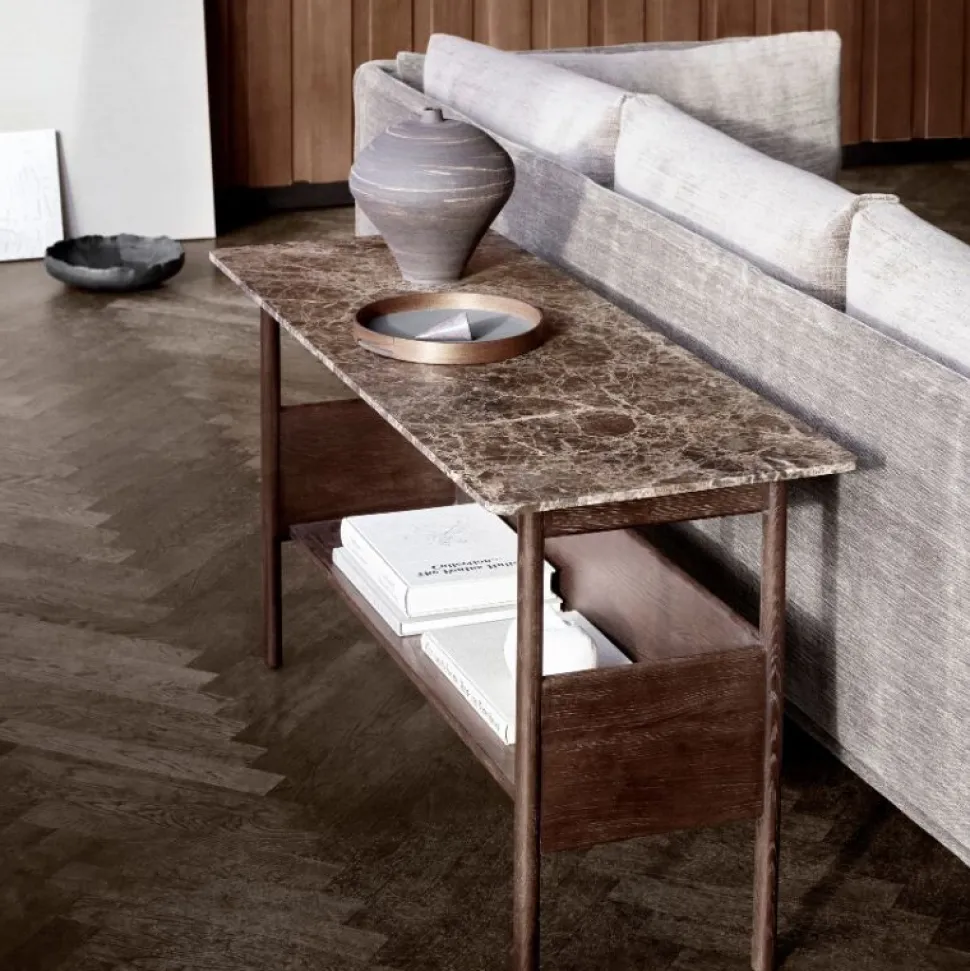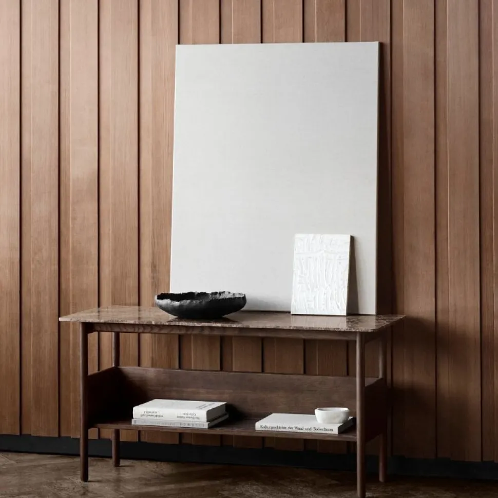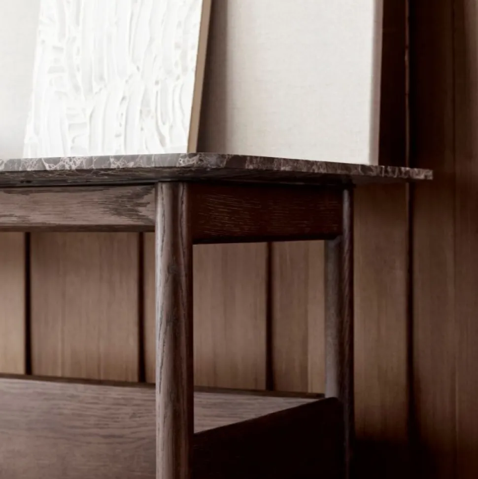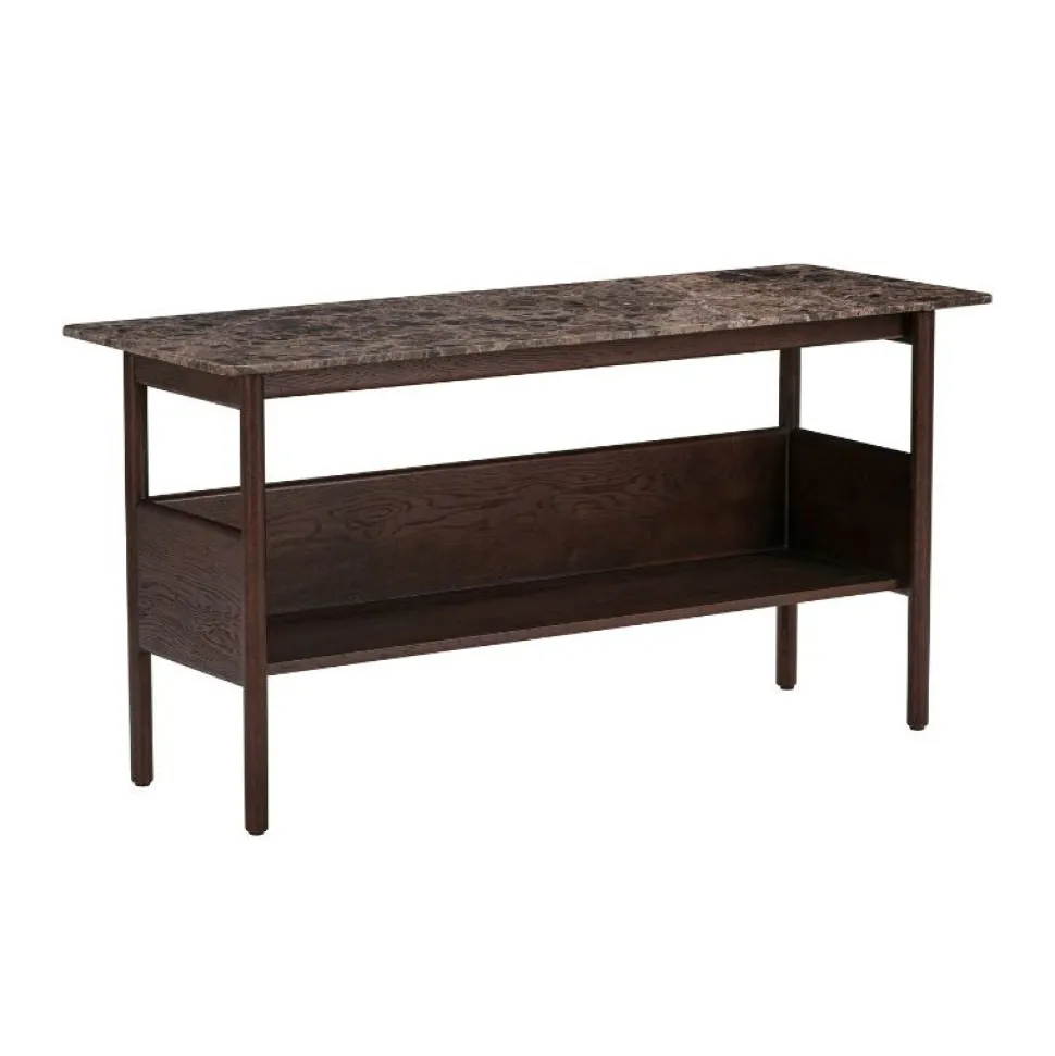 Raffinerede proportioner i elegant balance. Designer Jonas Wagell skaber en blød balance mellem materialerne. Varmen i det mørke træ og den brune Emperador-marmorbordplade fremmer en sanseoplevelse og tilføjer diskret elegance til ethvert rum.