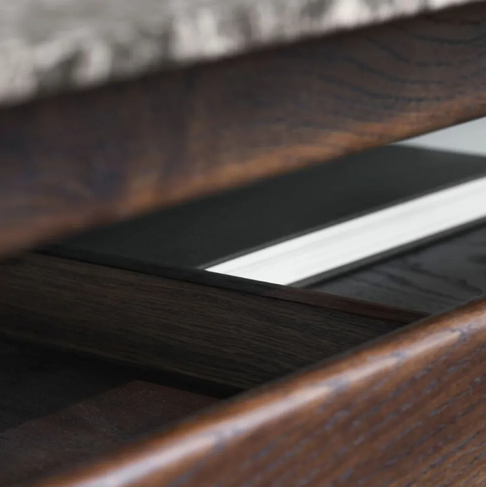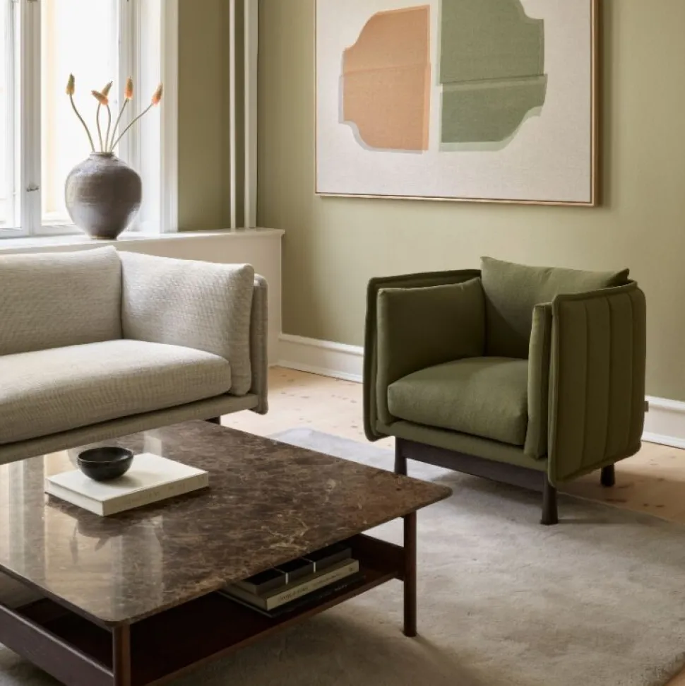Raffinerede proportioner i elegant balance. Designer Jonas Wagell skaber en blød balance mellem materialerne. Varmen i det mørke træ og den brune Emperador-marmorbordplade fremmer en sanseoplevelse og tilføjer diskret elegance til ethvert rum.