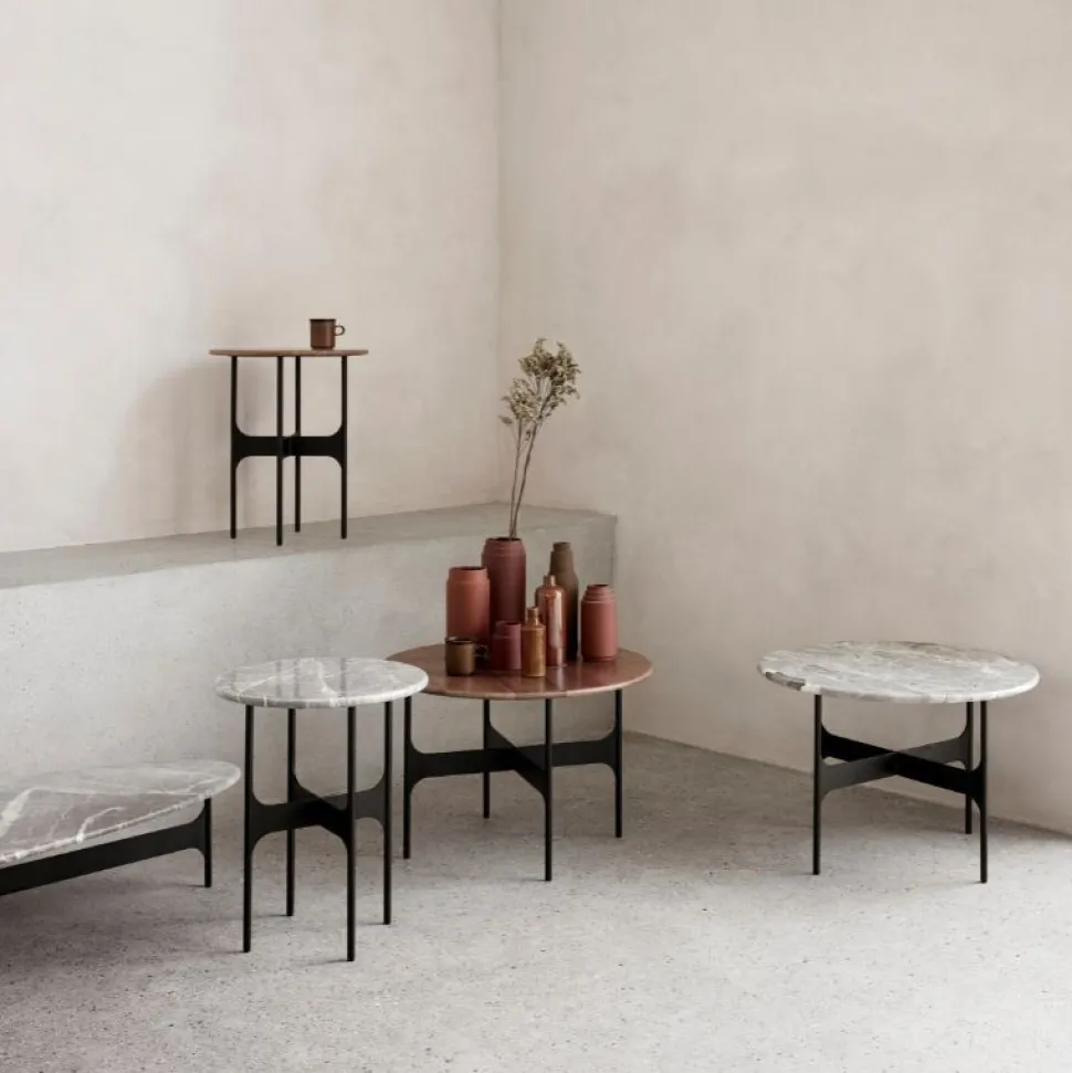 De små Floema-borde forener elegant geometriske former. Floema er lavet med bordplader i enten sort laminat, eksklusivt marmor eller massiv valnød for en førsteklasses håndfølelse. Bordet svæver på en let ramme af sort pulverlakeret stål.