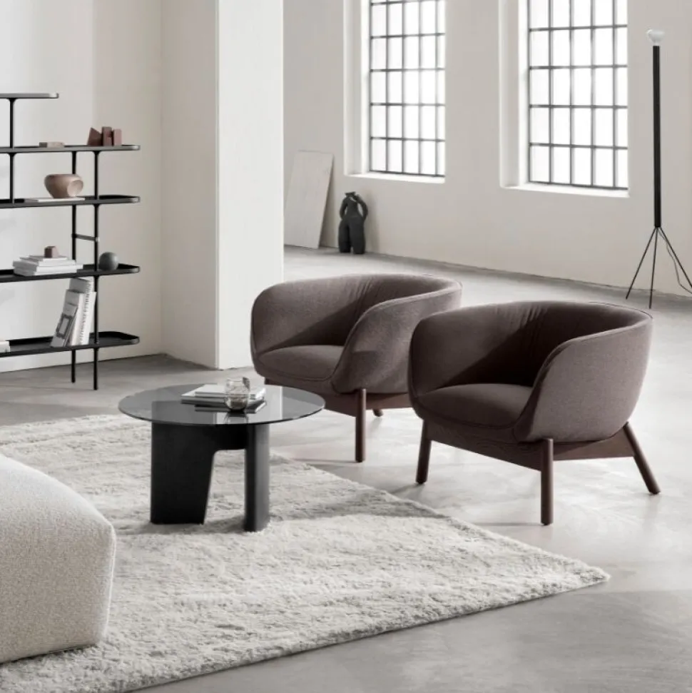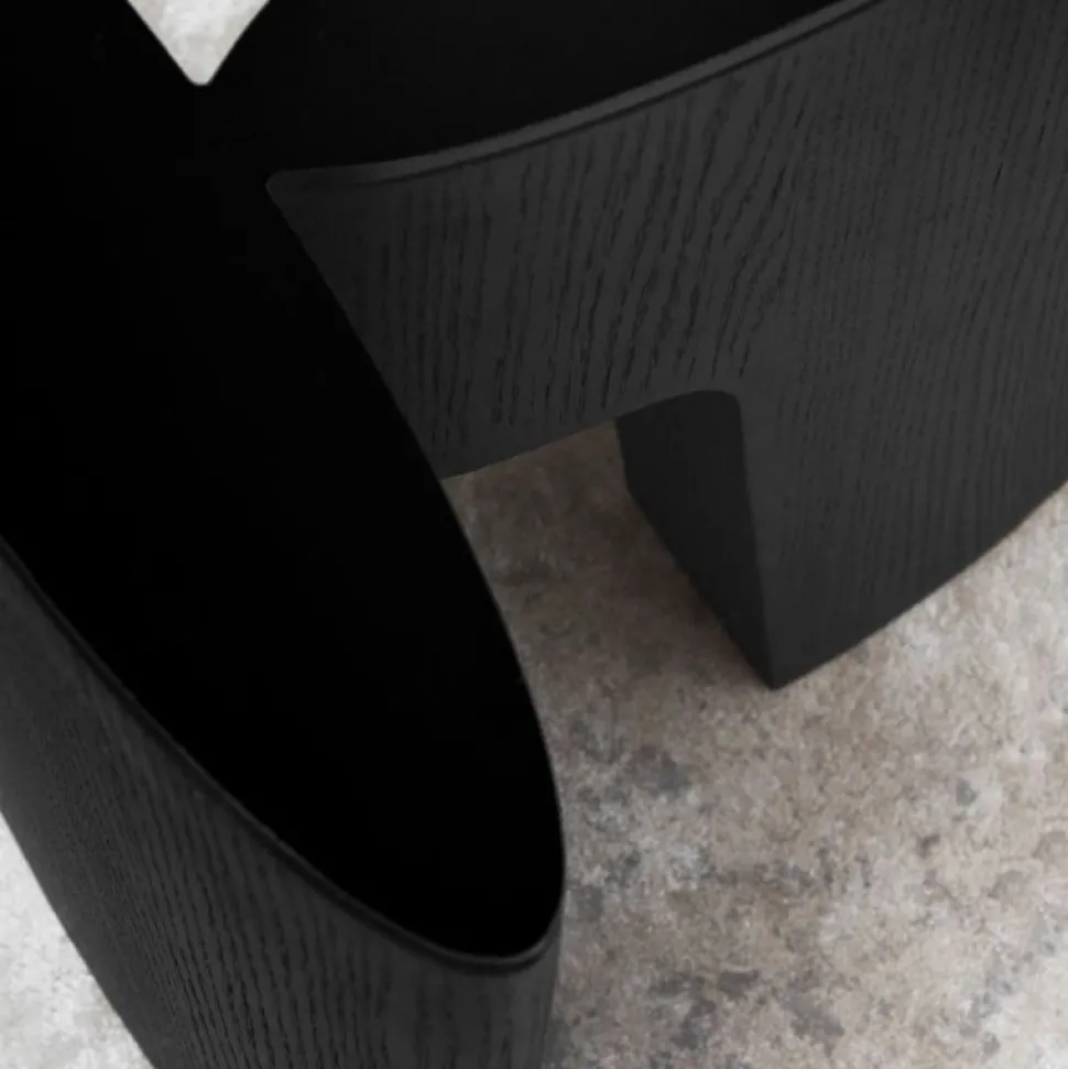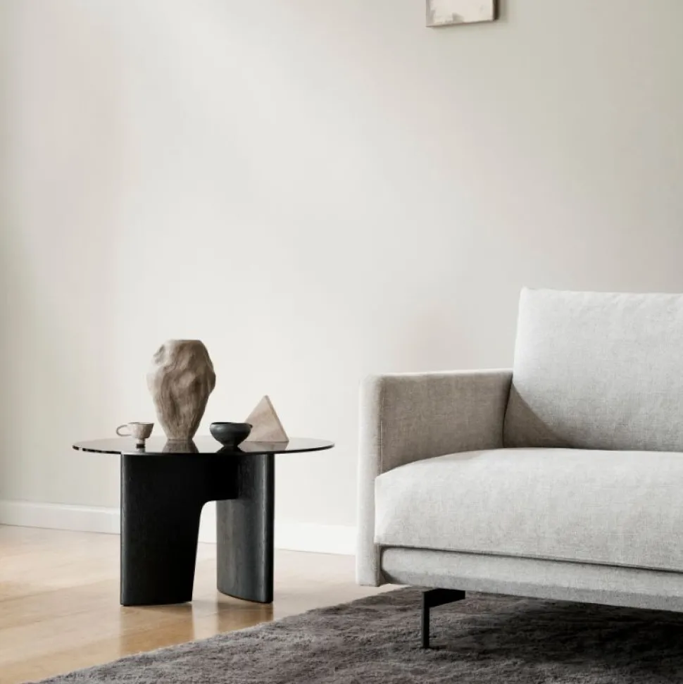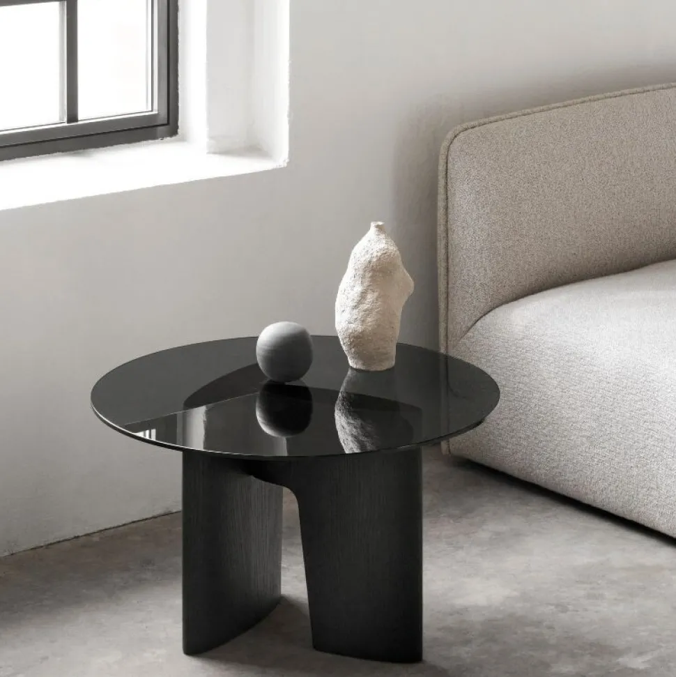 Stilren og moderne sidebord. Fås som sidebord og som ovalt sofabord. En skulpturel silhuet definerer Glyph-serien, designet af det tyske designstudie, Hoffmann Kahleyss Design. Den let gennemskinnelige bordplade i sorttonet hærdet glas svæver over den sortbejdsede egetræsbase, i meget gennemført stil, som resulterer i et smukt og enestående sidebord.