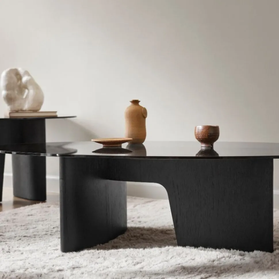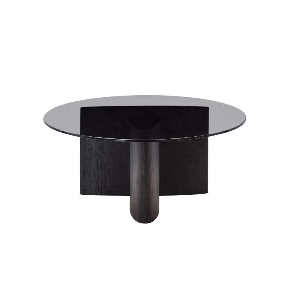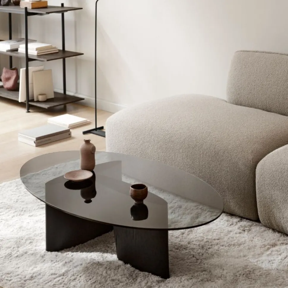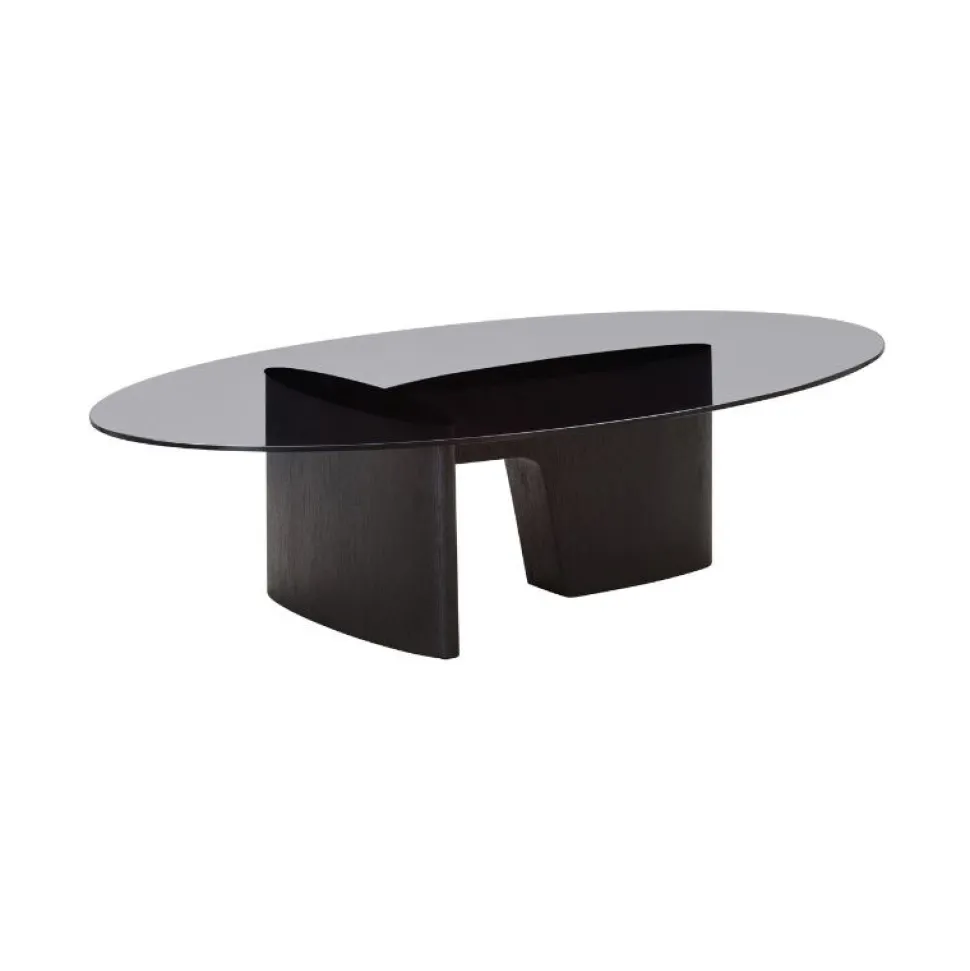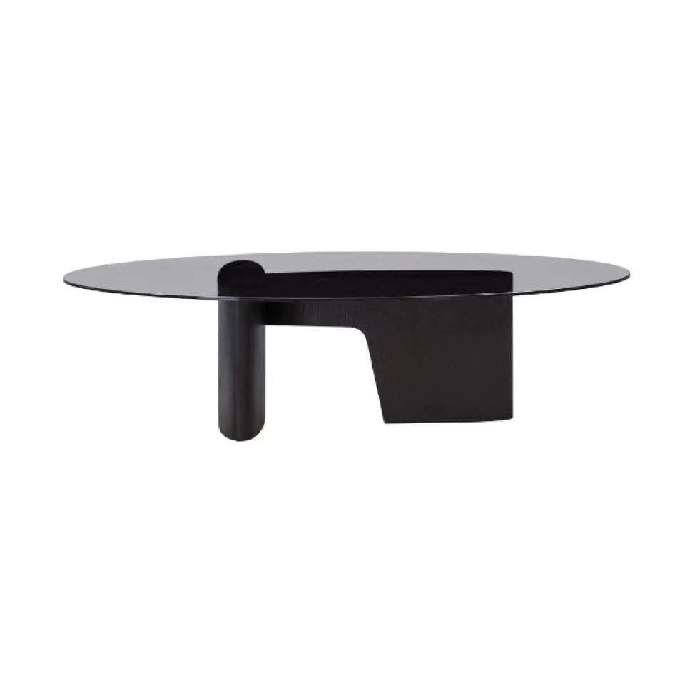 Stilren og moderne sofabord. Fås som sidebord og som ovalt sofabord. En skulpturel silhuet definerer Glyph-serien, designet af det tyske designstudie, Hoffmann Kahleyss Design. Den let gennemskinnelige bordplade i sorttonet hærdet glas svæver over den sortbejdsede egetræsbase, i meget gennemført stil, som resulterer i et smukt og enestående sofabord.